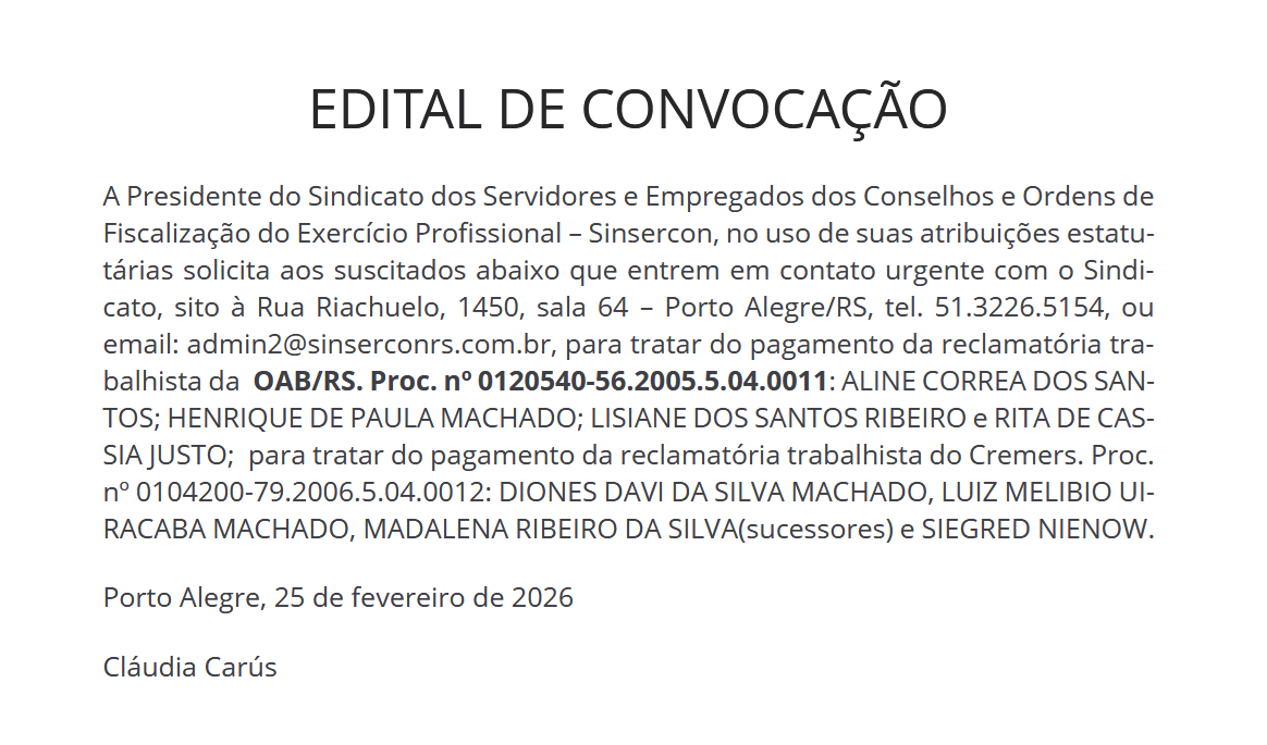 A Presidente do Sindicato dos Servidores e Empregados dos Conselhos e Ordens de Fiscalização do Exercício Profissional – Sinsercon, no